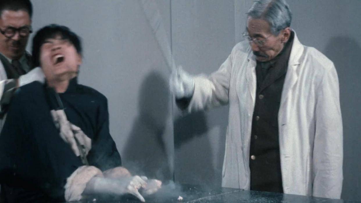 这部电影最颠覆的地方,是它不拍战场,不拍将军,也不拍什么英雄主义。它拍的是实验室,是白大褂,是手术灯。石井四郎擦手术刀那场戏,慢得瘆人。刀面一亮,反光里居然映出天皇的头像。这一下子就把军国主义和“科学”绑在了一起——不是野蛮杀人,而是“用科学的名义”杀人。那些实验,冻人、晒人、打细菌、看人怎么死,全都打着“研究”的旗号。他们不觉得自己在作恶,反而觉得自己在“为国献身”。这种把屠杀包装成“进步”的逻辑,比单纯的暴力更可怕。