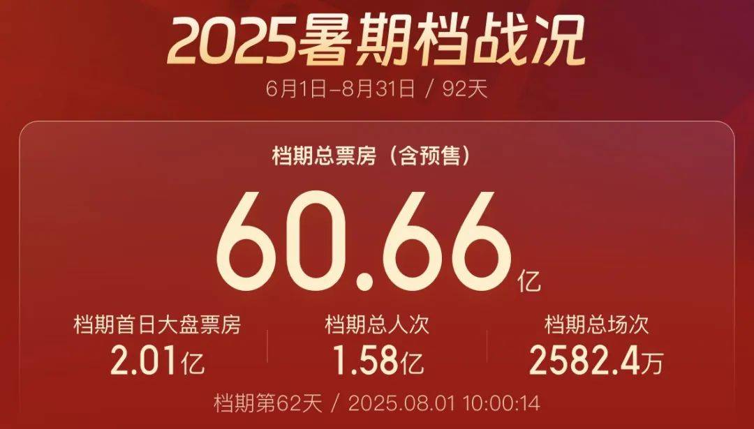 据猫眼专业版平台数据,截至8月1日上午10时00分14秒,2025年暑期档(6月1日—8月31日)实时票房(含预售)已达60.66亿。档期内观影人次1.58亿,放映场次2582.4万。