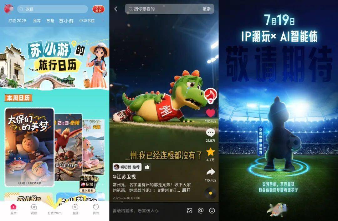 与之同时,AI玩法在内容创制中大显身手,亮点迭出:ai荔枝首个文旅智能体“苏小游”专区上线,以“苏小游的旅行日历”的形式每天更新一则江苏文旅故事。每天清晨,“苏小游”都在用独特的方式“丈量”江苏大地,带领用户领略这片土地的大好风光;围绕《江苏超会玩》打造的《给常州借笔画》《南哥的诱惑》《走进弗特博村》等多款AI短视频,在江苏卫视新媒体矩阵累计播放量超4.5亿,呈接力出圈之势;《江苏超会玩》更是推出了“空格州兽”周边产品,作为“IP潮玩+AI智能体”,这款AI专属看球搭子诞生于江苏卫视抖音账号“空格州兽借笔画记”,主打趣味社交、成长陪伴,情绪价值和科技属性拉满。