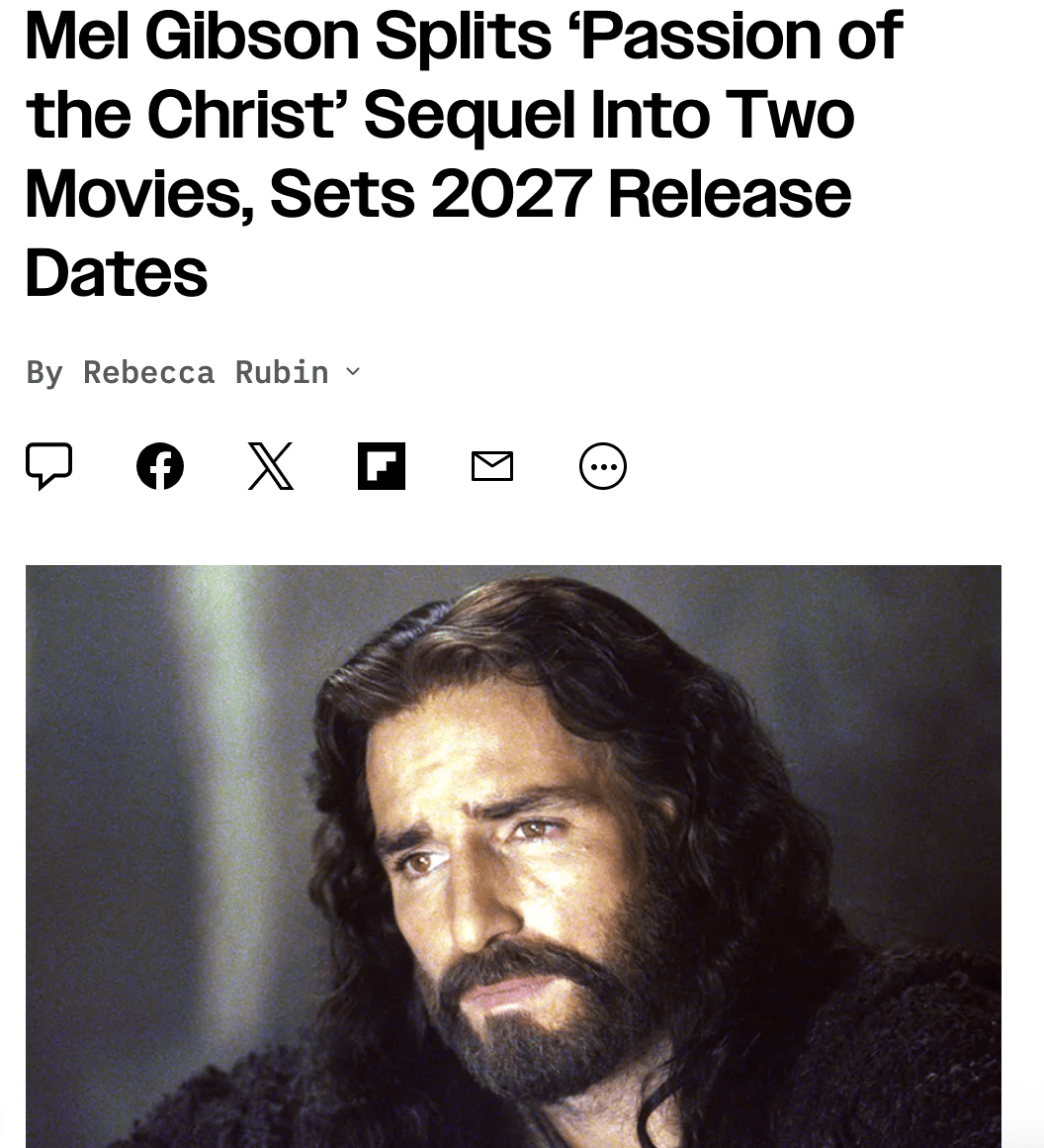 影片第一部分定于2027年3月26日(耶稣受难日)上映,第二部将在40天后的2027年5月6日(耶稣升天节)上映。