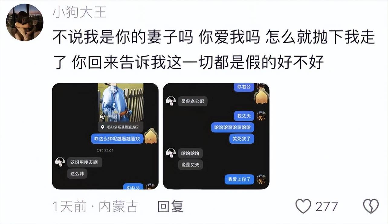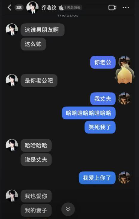女友还公开两人最后的聊天记录,两人说着甜蜜情话,女友夸他很帅,乔浩纹打趣说是老公,还说女友是他的妻子,彼此认定了对方。