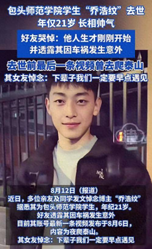 8月8日,包头师范学院大一学生乔浩纹因车祸不幸离世,结束了自己短暂又璀璨的一生。