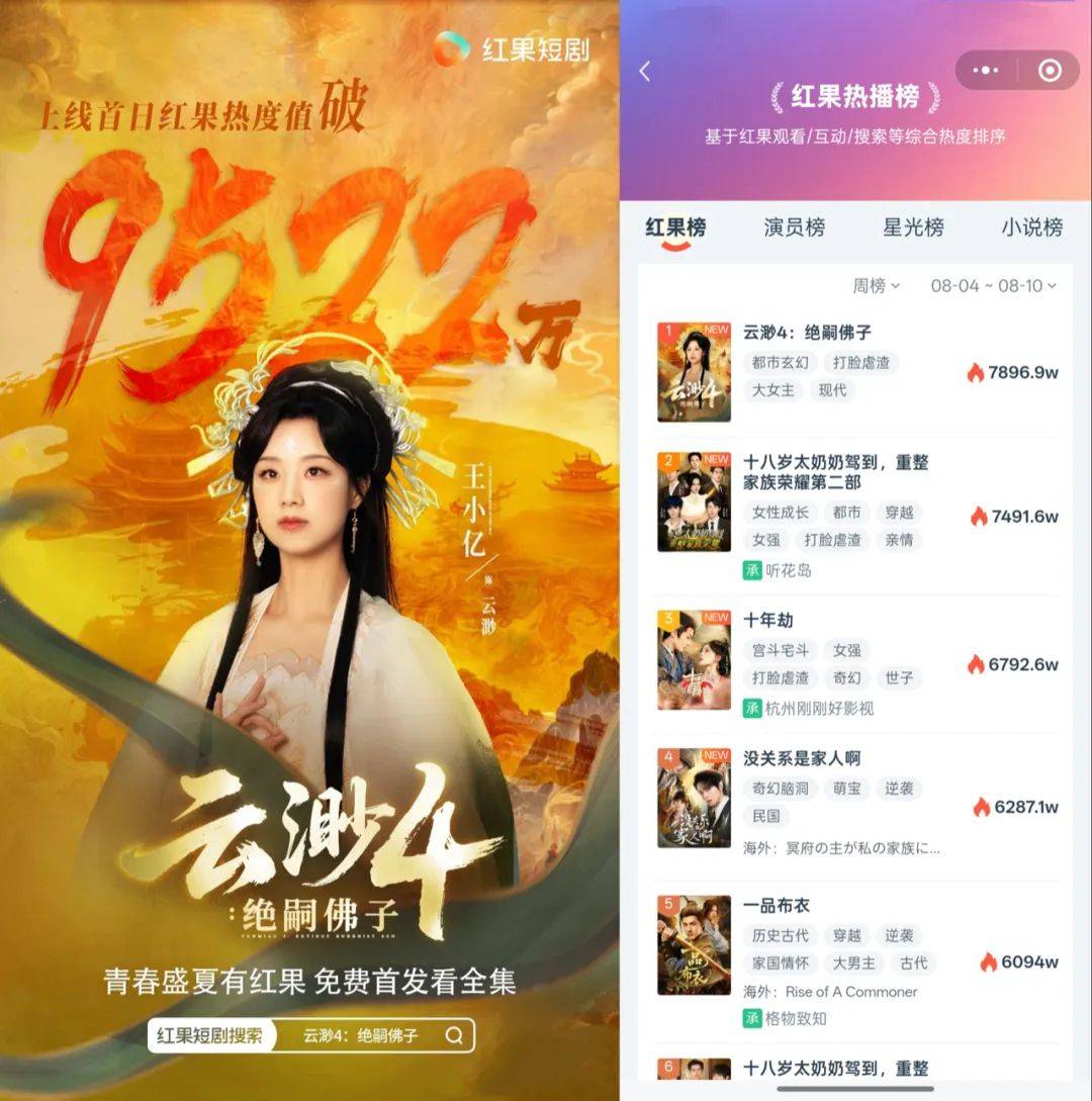 6月,《云渺3:镇魔世家》上线首日播放量破8000万,证明了系列化短剧的强大影响力;8月2日,《云渺4:绝嗣佛子》回归,在多部大IP、高人气题材同场竞技下,强势拿下周榜冠军。