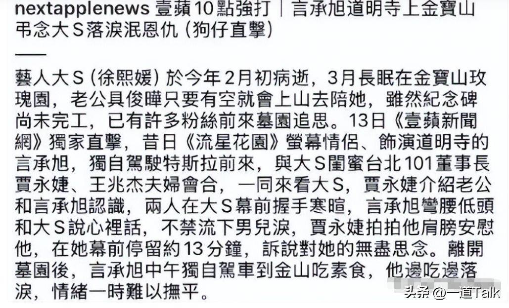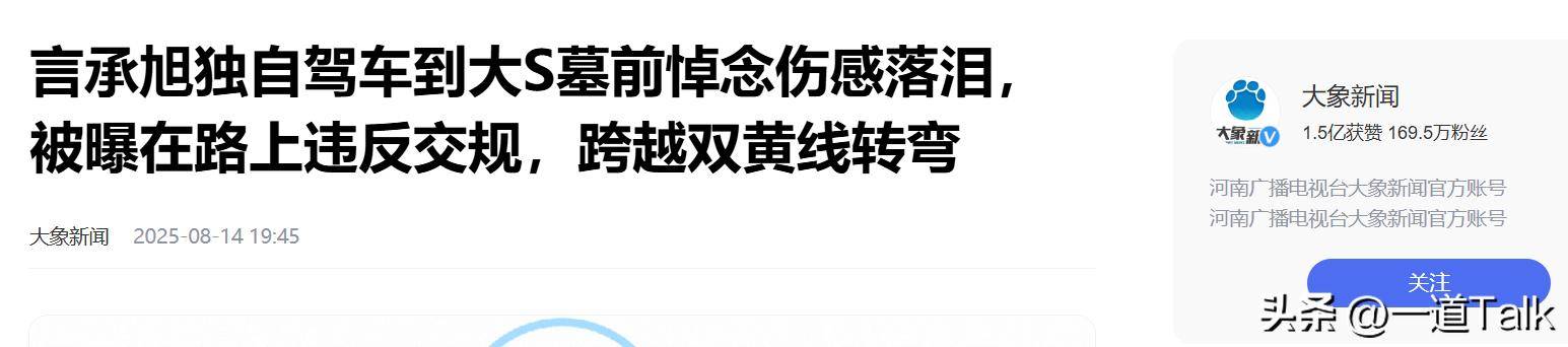 [1].官方媒体大象新闻《言承旭独自驾车到大S墓前悼念伤感落泪,被曝在路上违反交规,跨越双黄线转弯》2025.08.14
