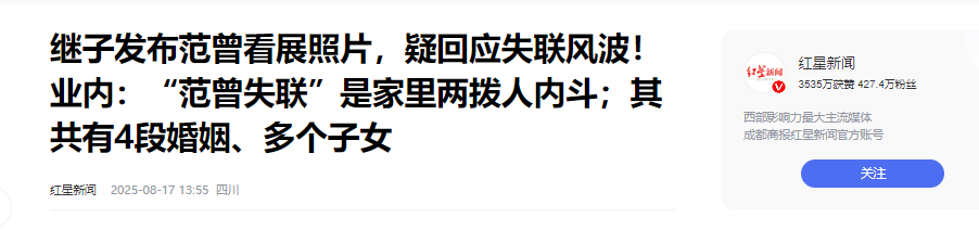2025年8月16日,范曾的亲生女儿范晓薇发文,说自己的父亲失联了,其实早在她发文之前,网上就已经有了很多曝料,但是当时都没有得到相关人士的承认。