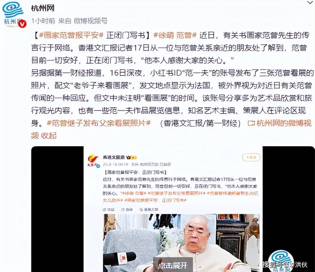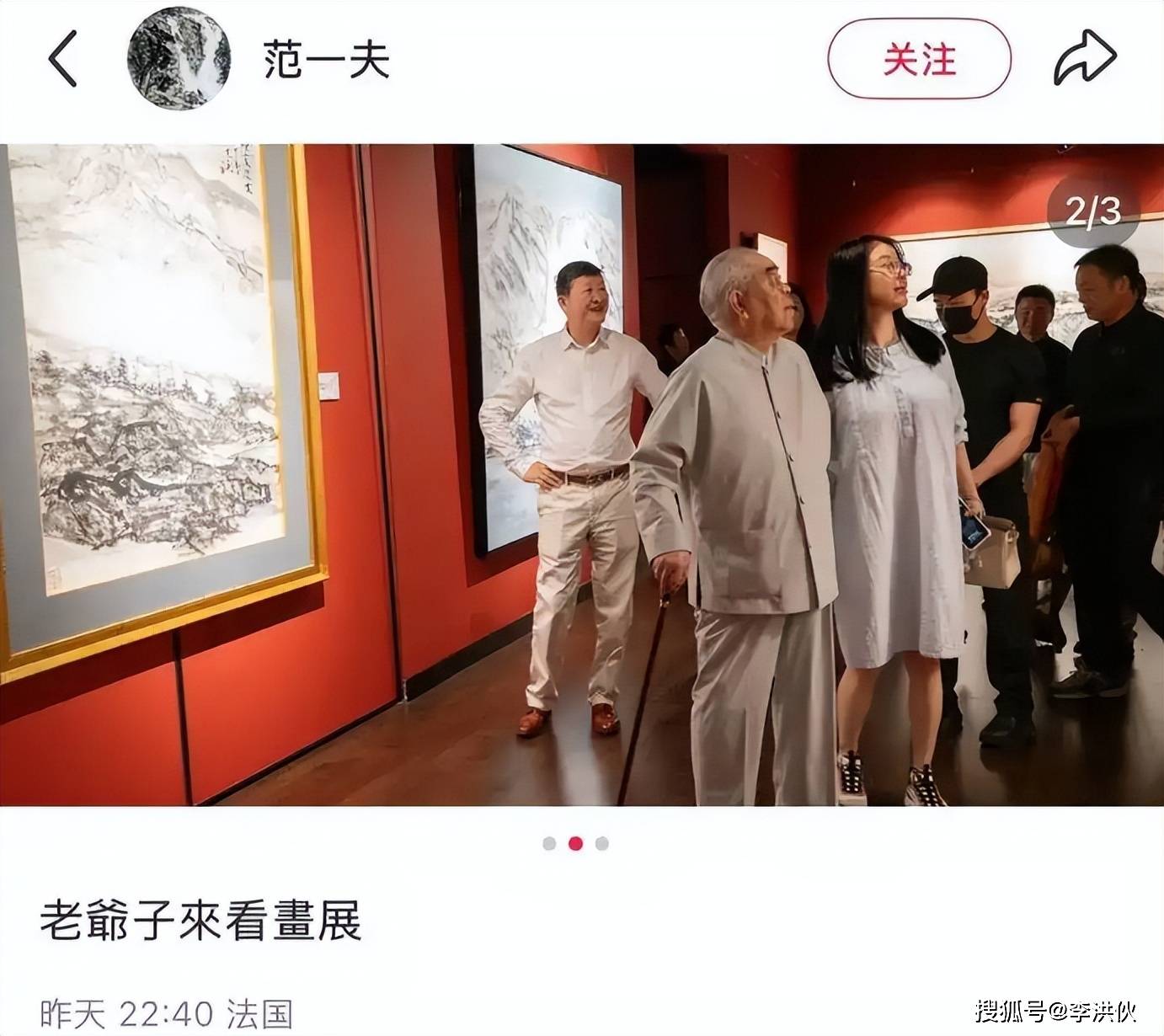 而且,就在女儿范晓蕙爆料父亲“失联”的那个晚上,一个叫“范一夫”(范曾继子)的账号,晒出了三张范曾在法国看画展的照片,还配文说“老爷子来看画展”。