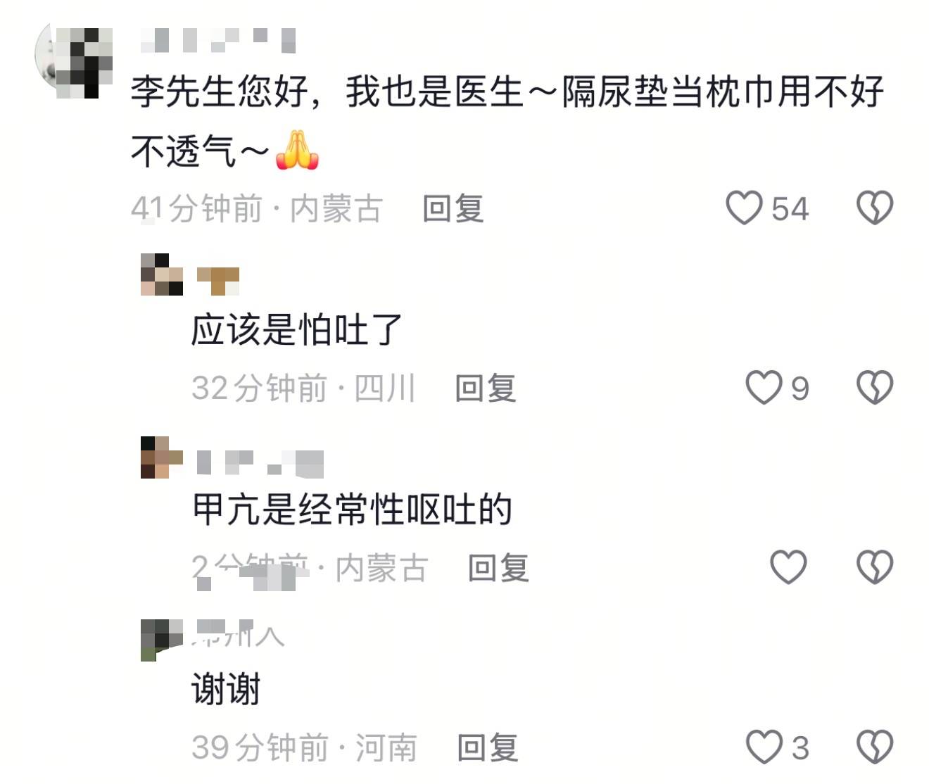 有不明所以的网友还好心评论,称“杰哥,不要枕着隔尿垫,这样不透气”,李连杰粉丝则提到甲亢会导致经常呕吐,所以需要枕着垫子。