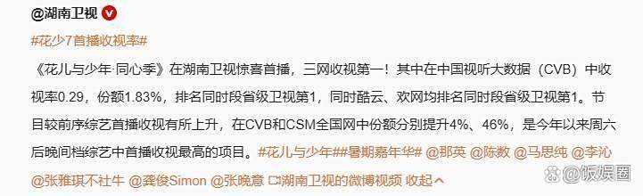 对比《花儿与少年》前几季首播收视率,《花少 7》的成绩更显难得。第一季首播时,虽节目新颖但在收视率数据上,并未像后续几季引发大规模关注;第二季首播收视率在当时市场环境下处于中等水平;第三季因节目创新不足,首播收视率未达预期 。而《花少 7》较前序综艺首播收视有明显上升趋势,在 CVB 和 CSM 全国网中份额分别提升 4%、46% 。与口碑逆转的第五季首播相比,《花少 7》在首播时吸引观众的能力也毫不逊色,在保持系列节目热度的同时,进一步拓展观众群体,这无疑表明《花少 7》在节目内容、嘉宾阵容以及宣传推广等多方面的努力得到观众认可,成功在综艺市场中打出漂亮的开局之战。