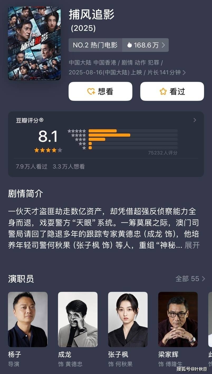《捕风追影》已经上映3天,豆瓣分数稳定在8.1分,说明大部分观众的评价都是4颗星左右,这已经属于电影爱好者们必看的门槛标准了。