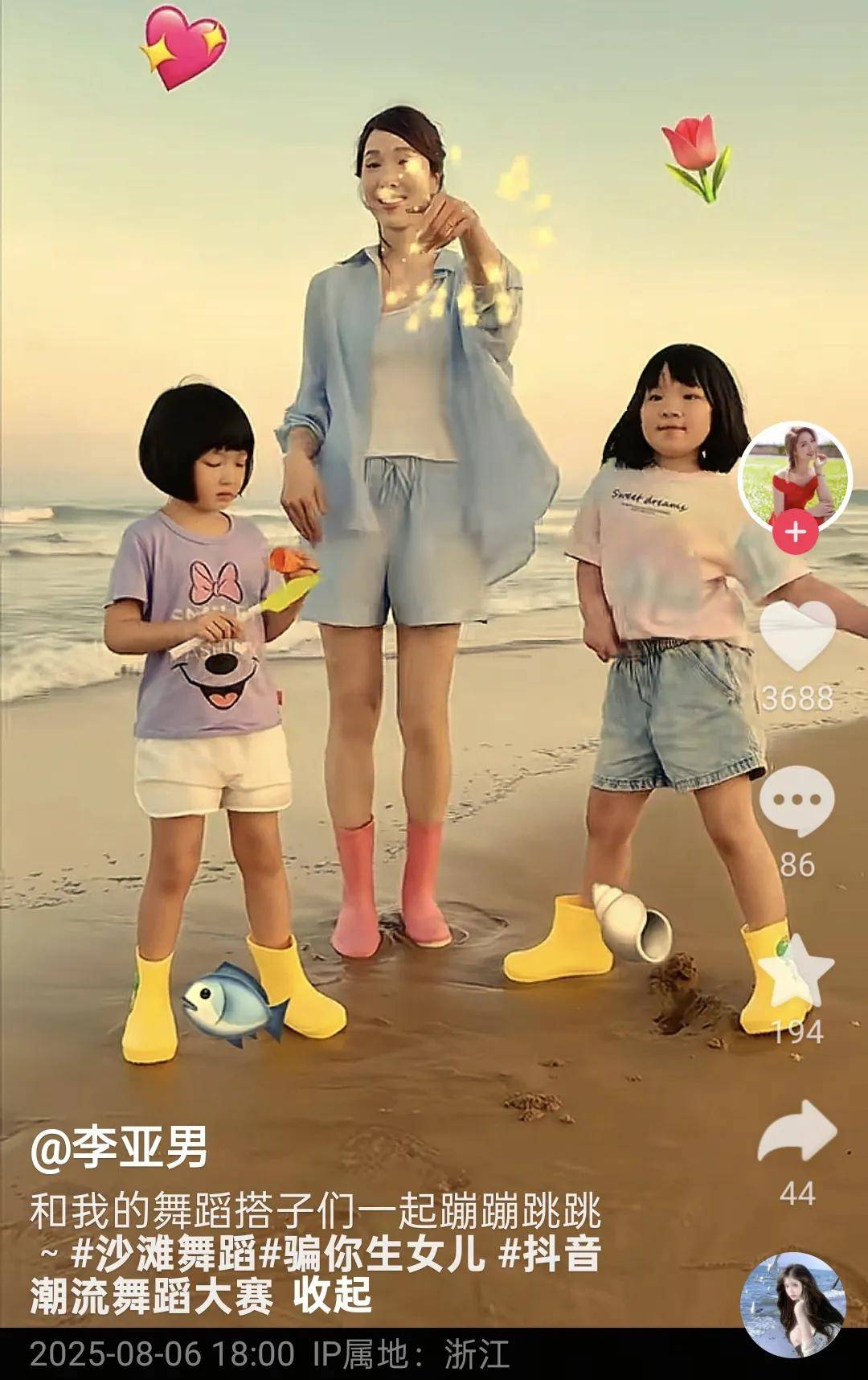 母女仨在海滩上各种画画画,玩的是不亦乐乎。不仅仅是画沙画,母女仨还一起在海滩上跳舞。李亚男说:“和我的舞蹈搭子们一起蹦蹦跳跳。”