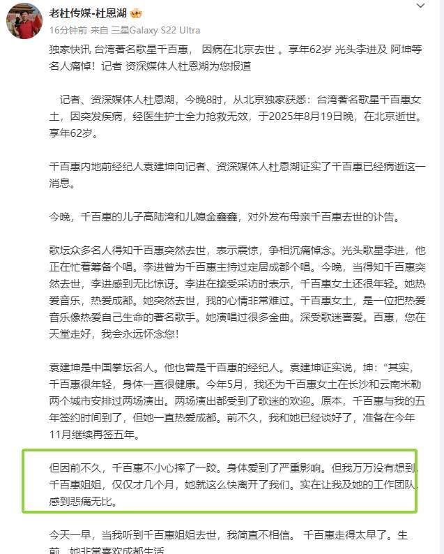 伴随着事件的进一步发展,媒体人杜恩湖透露,今天一早,圈内便传出了她去世的消息。