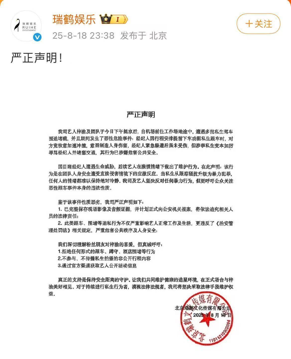 瑞鹤娱乐发布声明称,梓渝及团队于8月18日下午抵达北京后,自机场前往工作场地途中,遭遇多批私生驾车围追堵截。经纪人因行程安排提前下车劝阻私生跟车时,对方故意加速冲撞经纪人,还辱骂经纪人并堵塞交通。因目睹经纪人遭遇生命威胁,梓渝在激愤情绪下做出了维护行为。公司已完整保存现场影像及音频证据,并计划正式向公安机关报案,将依法追究相关人员的法律责任。