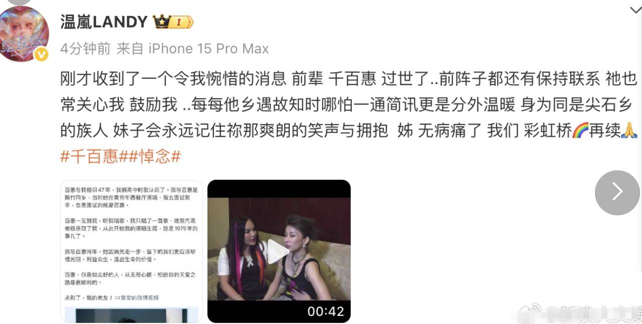 千百惠离世的消息传来,圈内好友纷纷发文悼念。黄安在讣告中写道:“永别了,我的老友!你是如此好的人,从无恶心眼,相信天堂之路会很顺利。”温岚发文:“无病痛了,我们彩虹桥再续。”