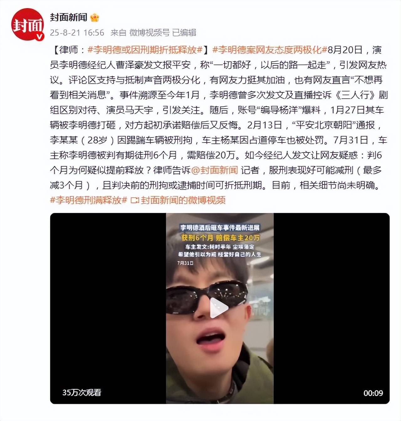 今年2月,李明德因砸车事件被刑事拘留,7月31日法院正式判决有期徒刑6个月,赔偿车主20万元。判决书墨迹未干,经纪人8月就高调宣布“回归”,这让不少网友直呼看不懂:“判6个月怎么20天就出来了?”“现在坐牢都搞闪电战?”