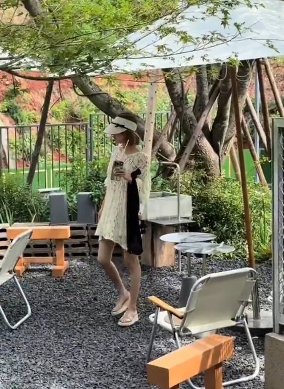 赵露思拿着饮品悠闲漫步,好惬意。