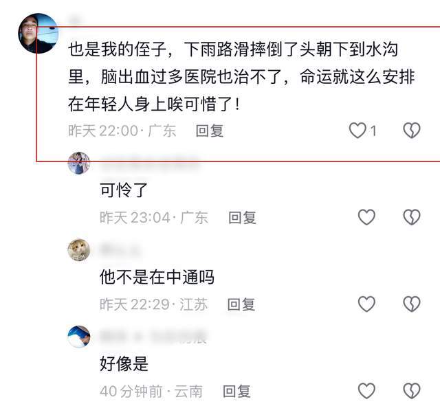 关于其去世的原因,知情人士表示他是因为下雨天路滑,不小心导致摔倒,头朝下倒在了水沟里,这一行为导致其脑出血,最终医院也救不了。