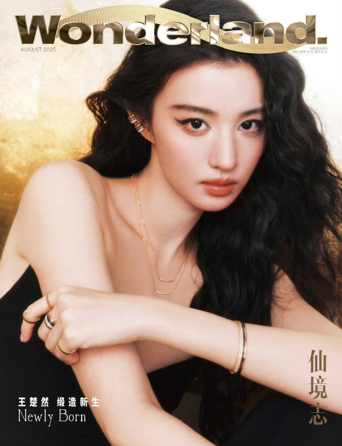 王楚然金色发饰点缀卷发,五官精致。