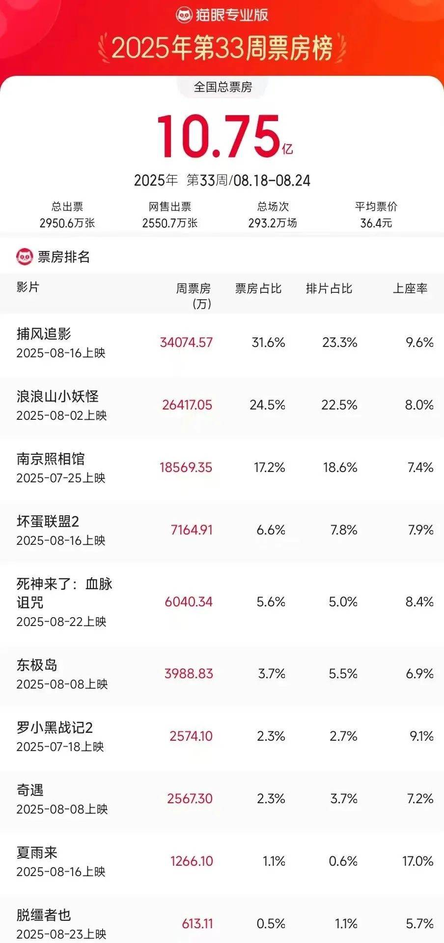 由上海美术电影制片厂参与出品的神怪动画喜剧《浪浪山小妖怪》公映第四周报收2.64亿列周榜第二,目前累计票房已接近13亿,最终成绩有望冲击16亿。