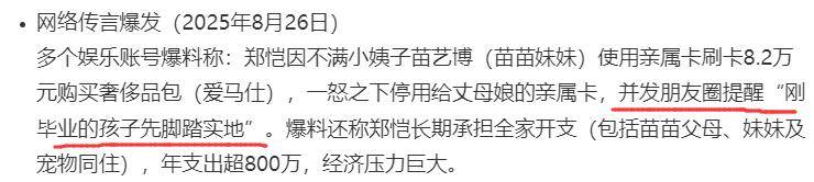 事情的起因还要从一则爆料说起,有网友发布视频,说苗艺博一直跟着姐姐、姐夫住在一起,苗艺博还刷了郑恺给丈母娘的亲属卡买了一个价值8.2万的包包。