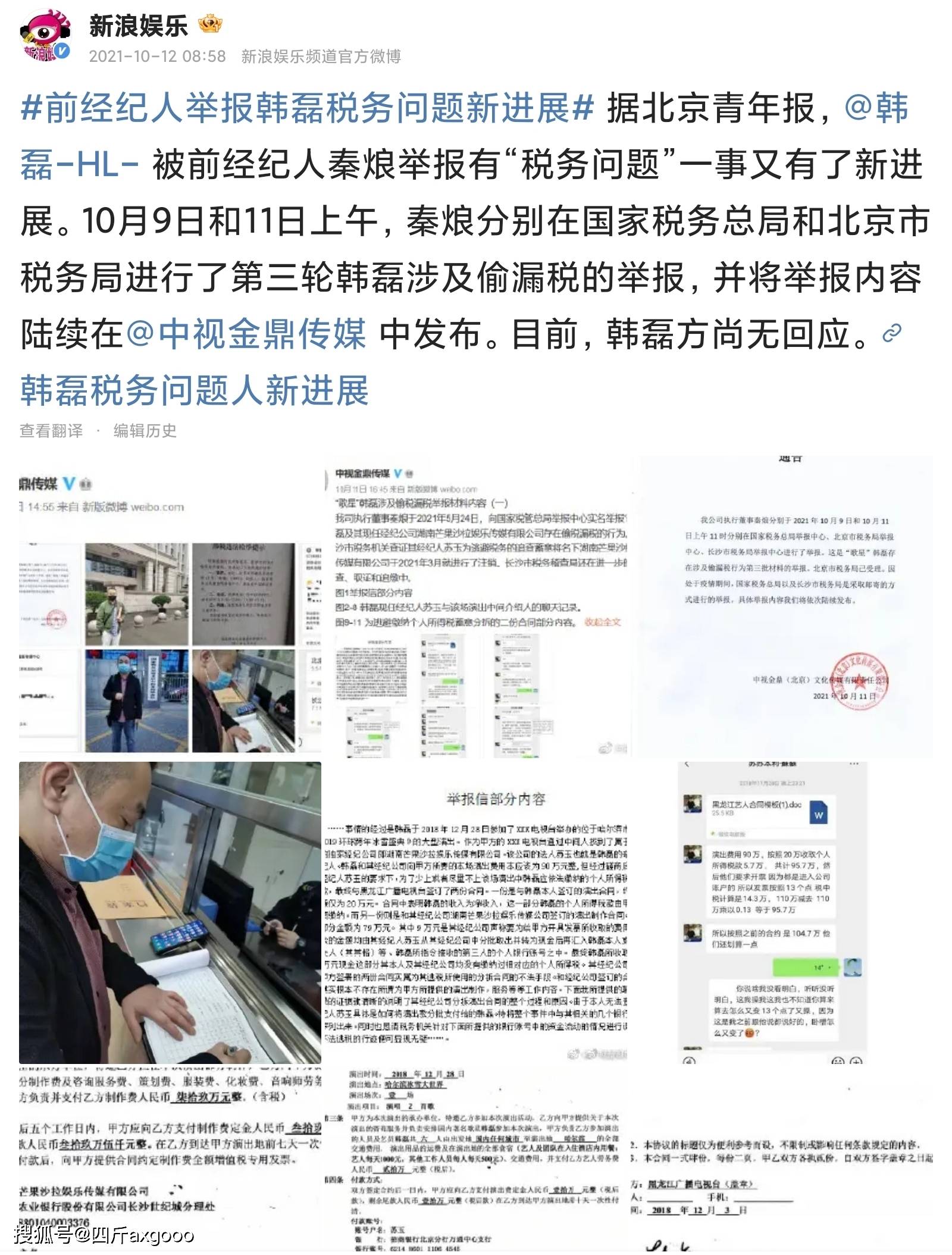 话说,若我没记错,韩磊此前也曾被曝出一些负面新闻,不过均与税务问题相关 —— 韩磊的前经纪人曾举报他存在税务问题,甚至将事情举报至国家税务总局。