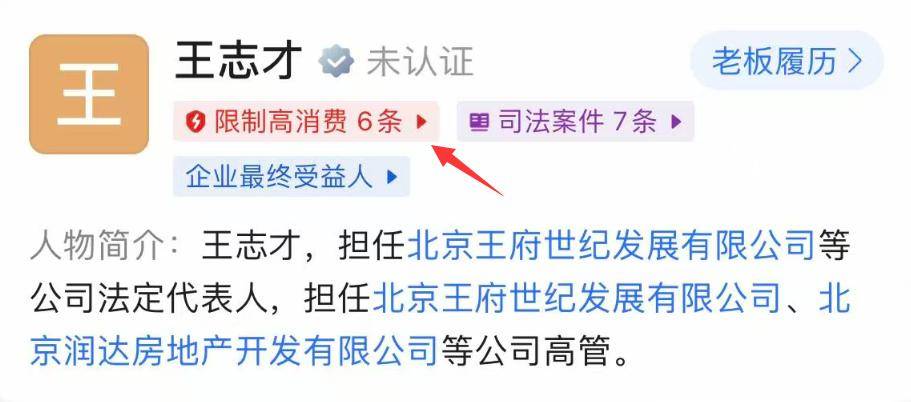 据官方信息显示,王志才旗下的王府世纪发展有限公司已经被列为被执行人,此外还被限制高消费,更多消息显示,王志才名下已经有6条限制消费令。