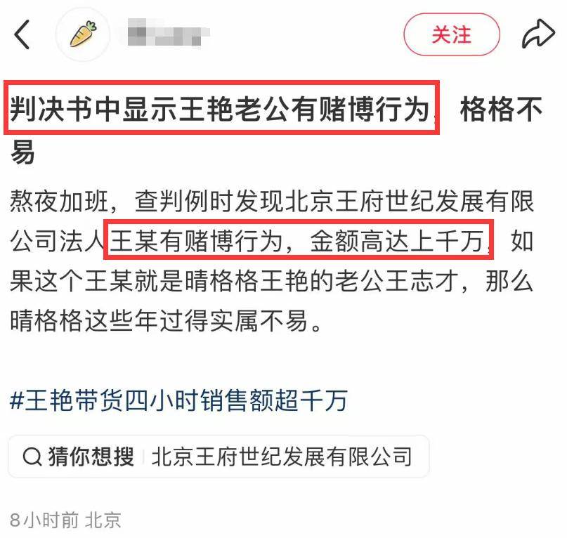 可如今王艳的豪门梦破碎,其老公不仅被限制高消费,网友还扒出他沉迷赌博,常因欠赌债被讨要。