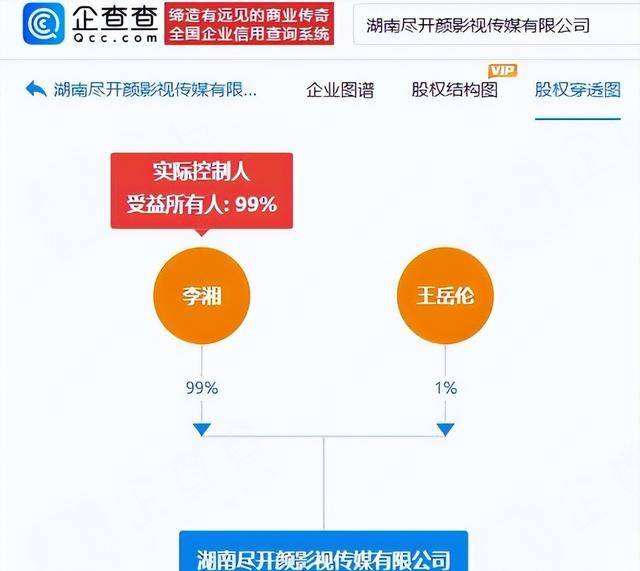 今年,他们共同成立了湖南尽开颜影视传媒等公司,股权结构清晰明了:李湘占股99%,牢牢掌握决策权,王岳伦占股1%,担任法定代表人和执行董事。