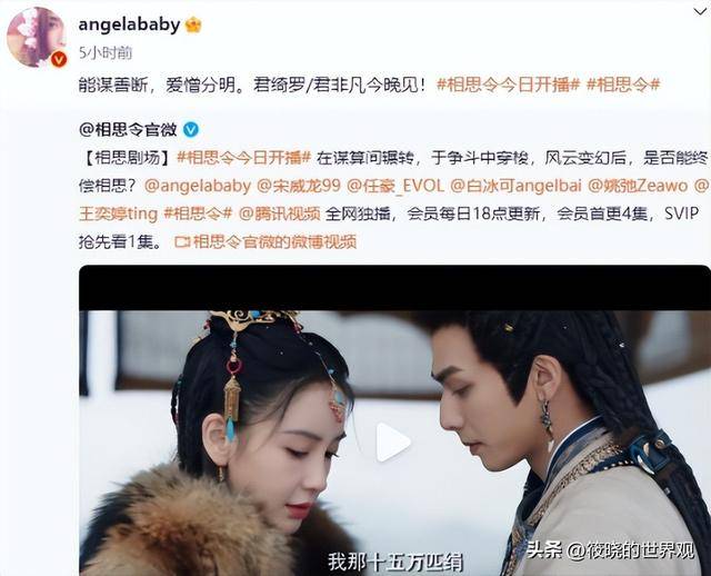 同年,杨颖还以女主的身份出演了古装剧《相思令》,合作演员包括当时的小鲜肉宋威龙。