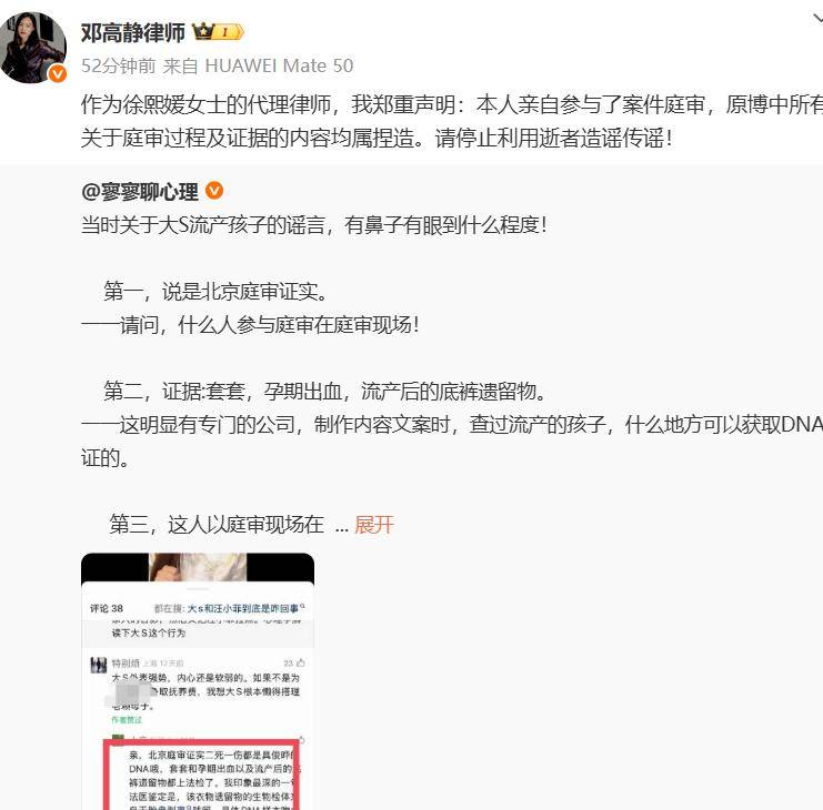 大S生前的代理律师邓高静在今天深夜,突然发布了一则消息,驳斥了好几条跟大S相关的谣言。