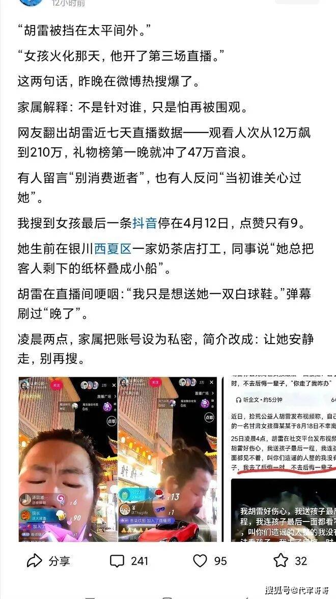 面对汹涌的舆论,胡雷也曾试图澄清:他说发视频是为了辟谣 “女孩遭家庭虐待” 的谣言,强调 “孩子家里没有重男轻女,只是没扛住几句批评”;还提到自己凑了 2 万元(其中 5000 元是自己的),想带去参加葬礼,送女孩最后一程。可这些解释,在网友看来 “苍白无力”,毕竟,“辟谣” 未必需要靠直播完成,“送别” 也不该以 “镜头记录” 为前提。
