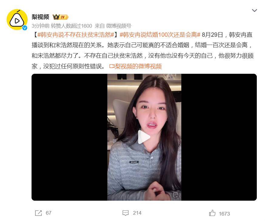 8月29日,网红韩安冉在直播中扔出一枚“舆论炸弹”:她正式宣布与第四任丈夫宋浩然达成离婚协议,并抛出一句“就算结婚一百次,最终还是会离”的自嘲结论,瞬间冲上热搜。