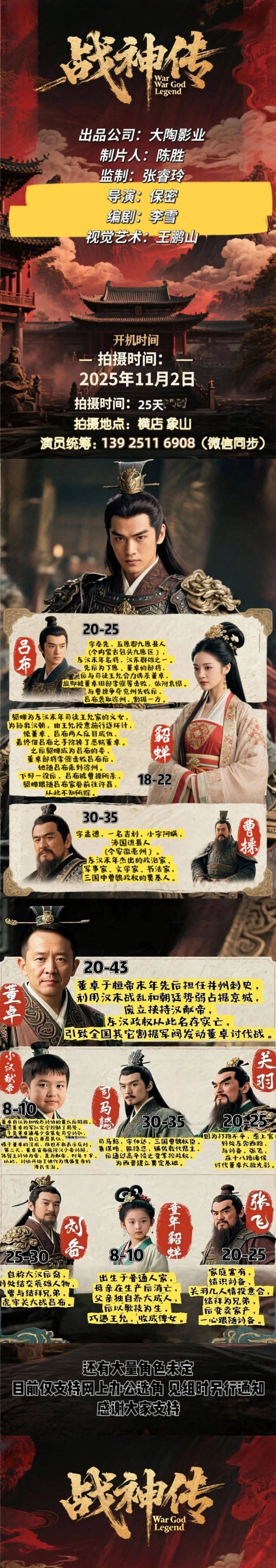 免责声明:戏客Seeker公众号(“本平台”)中全网组讯的信息、内容(“组讯信息”,包括但不限于影视项目名称、项目介绍信息、出品公司信息、导演信息、选角团队信息、拍摄相关信息、联系方式等)均来源于内容信息相关方提供或互联网公开信息。本平台不对组讯信息的真实性、准确性、完整性、及时性、关联性、适用性及安全性提供任何明示或默示的担保。请您谨慎参考或使用组讯信息,并确保您的人身、财产安全,本平台不对您使用或参考组讯信息而造成的后果承担任何责任。