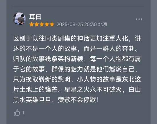 该剧在吉林白山实地取景,林海雪原间尽显豪迈气概,真实还原烽火岁月中小人物的坚韧与大义。该剧开播酷云就飞起,十几分钟收视率达到2%,观众更是迫不及待给予好评。