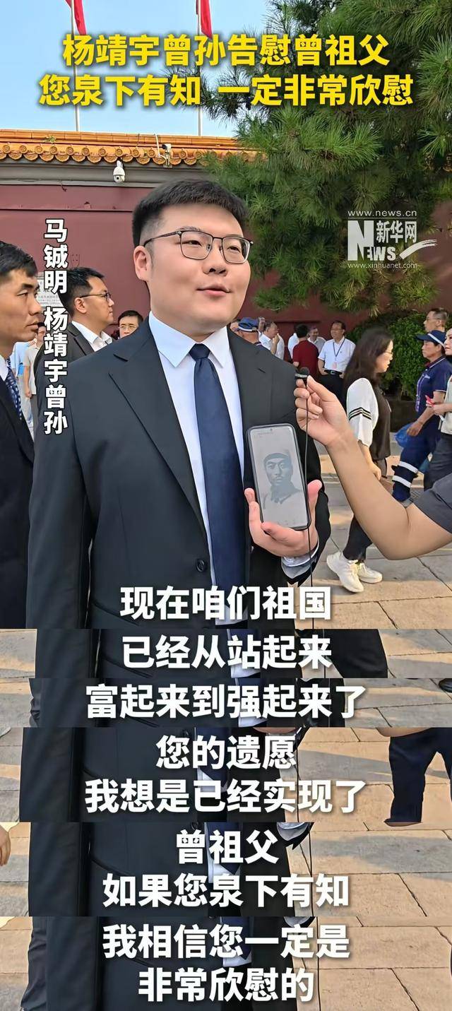 杨靖宇曾孙举着曾祖父的照片,告诉他,现在我们国家已经站起来、富起来、强起来了,曾祖父的遗愿实现了。