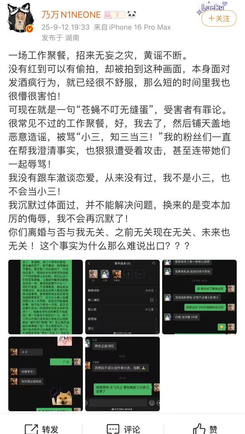 乃万表示自己一年都见不到他们几次,怎么就变成为了证明不是出轨早已离婚了呢?什么时候跟车导有“男女”关系了?希望两位正面说句澄清的话,不要把她当活靶子,自己到了今天,靠的是一个字一个音写到今天,简直天降的无妄之灾,还有地方去说理吗?