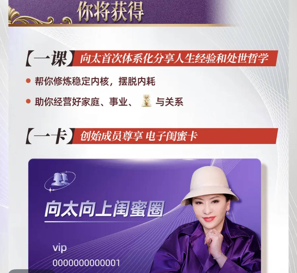 今年,先有吴彦祖、霍汶希、王晶卖课,最近,输出了一个多月的金句视频、以大女主姿态教大家过幸福人生的向太也上架了《向太向上闺蜜圈》的大师课。