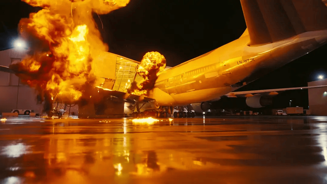 你会感受到的。《信条》的动作戏和场景设计令人着迷。早期一场发生在餐厅厨房里的打斗,展现了主角那种举重若轻的凶猛;一架波音 747 撞进自由港仓库的景象更是令人惊叹(而且是实拍)。随后在仓库走廊展开的搏斗不仅拍摄精良、编排出色,还精妙地运用了影片的逆向时间概念。同样精彩的还有那场劫盗追车戏——一辆撞毁的车顶着引擎盖腾空而起,恢复如初毫发无损,稳稳落地后倒转着疾驰而去。