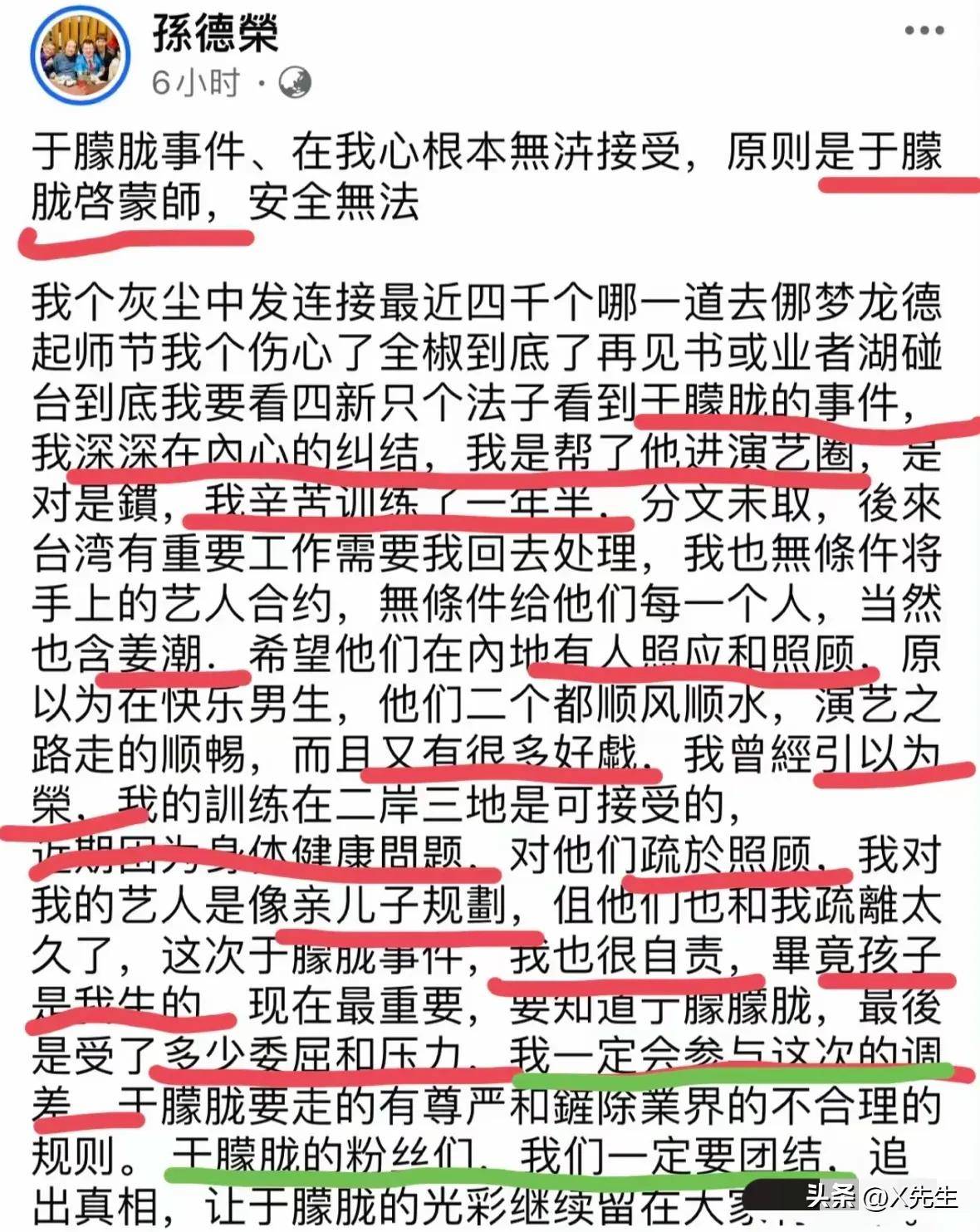 有一个自称是于朦胧师父的知名经纪人孙德荣已经发文表示要追查真相 孙德荣说是于朦胧的启蒙老师,是他帮助于朦胧进入了演艺圈