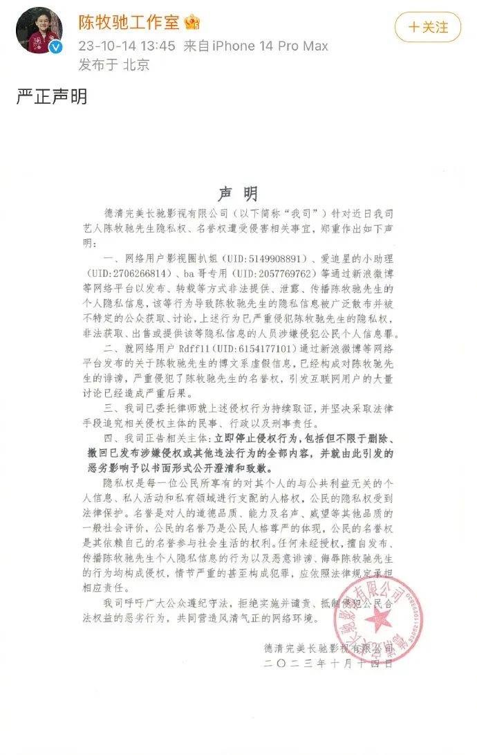 第二天,陈牧驰工作室火速发声明,称陈牧驰和吴楚一的相关爆料都是虚假内容,构成诽谤,公司已经取证准备维权,追究造谣他俩关系者的法律责任。