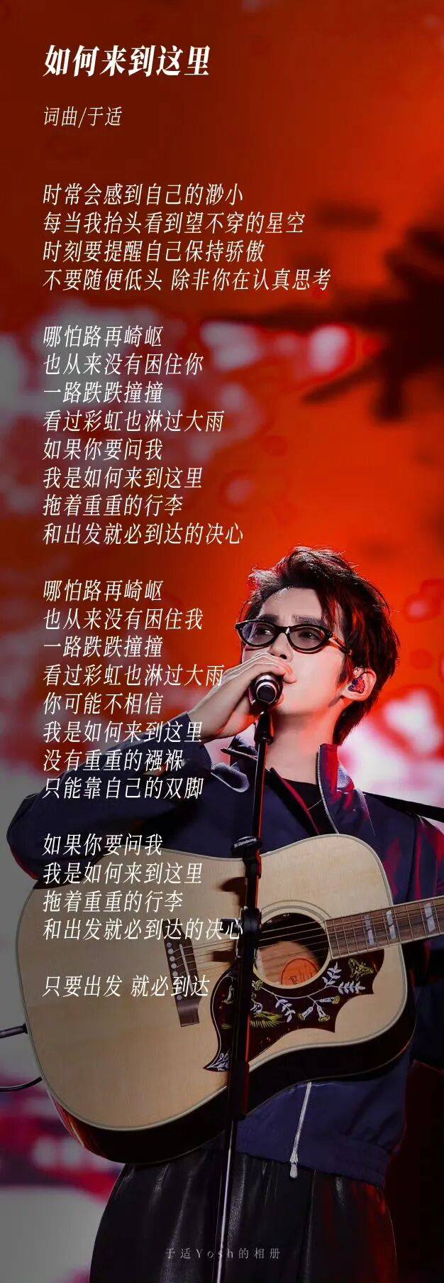 在他的新专辑《适诗》还未公开的六首歌里,有一首《如何来到这里》。他又把这句话写进自己的歌里:“只要出发,就必到达”。