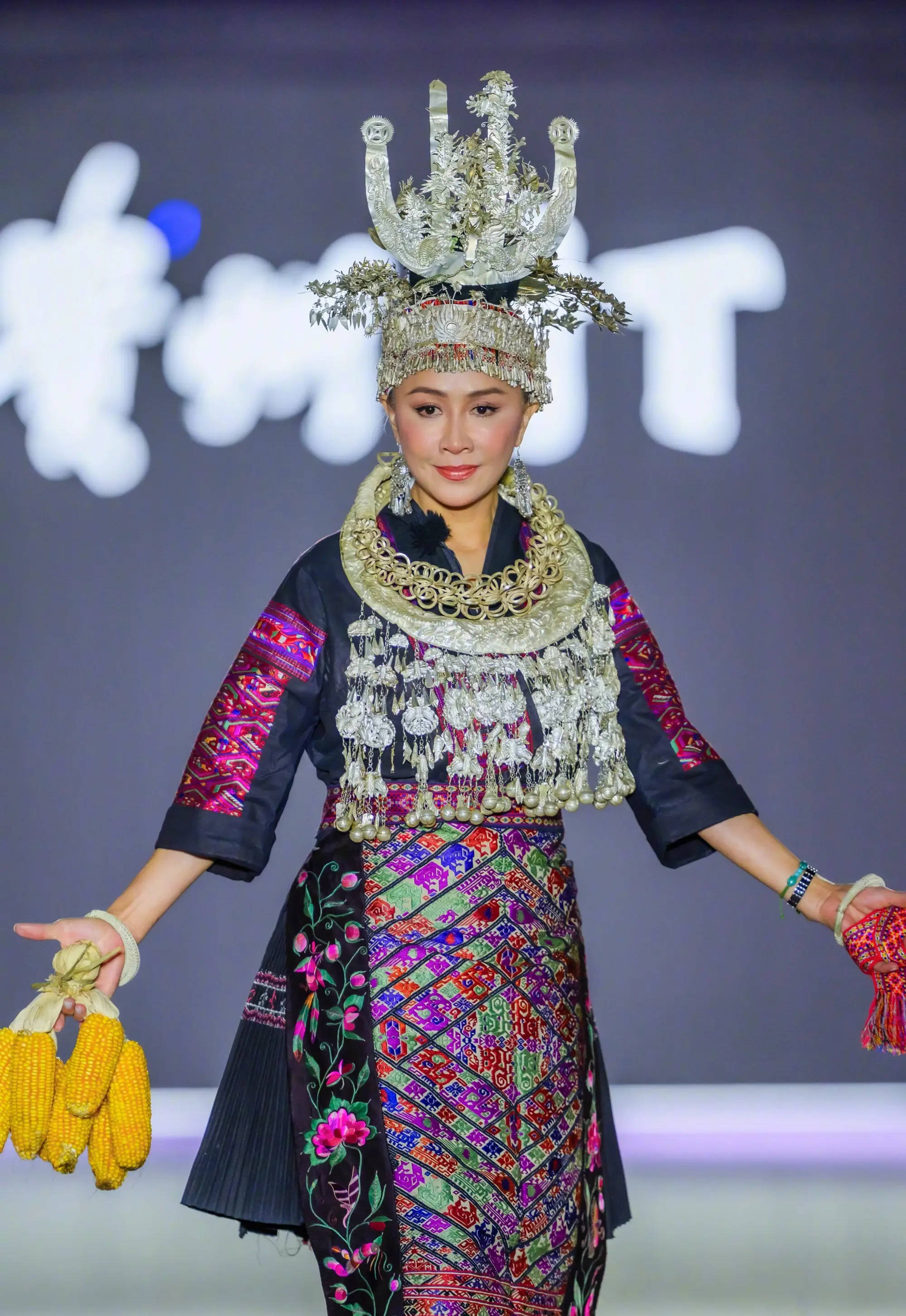 刘嘉玲穿着民族服饰,手里拿着玉米在T台上走秀,状态在线!