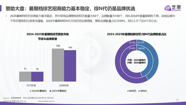 先来看综N代,上半年经典综N代播放量集体下滑的场面令人低迷,不过到了暑期档,综艺市场略有好转,尤其是综N代的播映指数明显上涨(艺恩数据)。招商层面,综N代仍然展现出不凡的吸金力,相比2024同期,赞助品牌数量占比达59%,同比上升4个百分点。