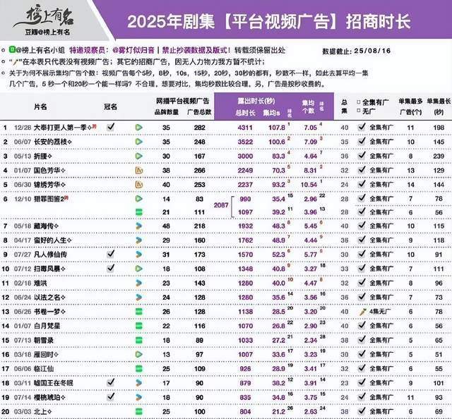 从题材层面讲,古装剧招商基本盘向来稳定,但全集有广越来越成为古装剧招商的“新考验”。前者数据为证,豆瓣@榜上有名统计的2025剧集平台视频广告招商时长TOP20中,古装剧占据了12席;合作品牌数20+的15部剧中,古装剧占据了10席。