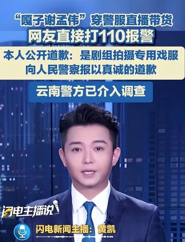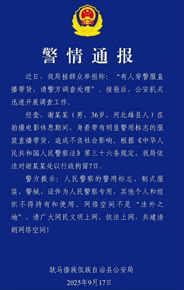 9 月17 日晚上,云南耿马县公安局直接发了通报:谢孟伟因为穿带有明显警用标志的服装直播带货,造成不良社会影响,被行政拘留7 天。