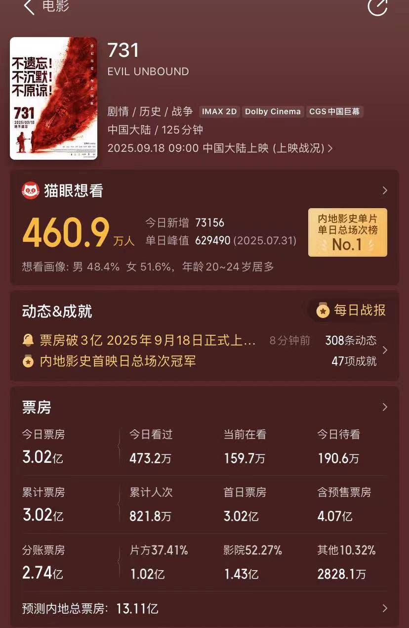 《南京照相馆》是7月25日上映,第一天是周五票房收入1.58亿元,第二天持续走高2.67亿元,第三天是4.13亿元,第五天是5.17亿元,一直在不断地上升,豆瓣评分8.7分,如果《731》能够品质达到《南京照相馆》票房可能预测不会是13亿元,应该是31亿元。