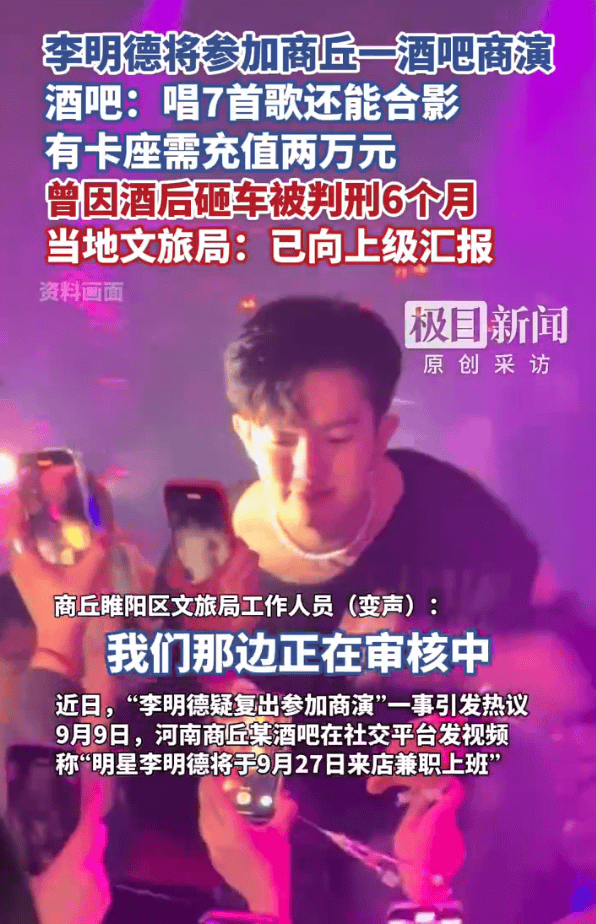 近日,“李明德疑复出参加商演”一事引发网络热议。9月19日,“极目新闻”记者以消费者身份联系该酒吧时获悉,李明德将于27日演出一小时左右,消费者可以花费200元“站立观演”,也可以“充卡订台”,订台部分价格已达上万元。酒吧工作人员称,李明德将于当晚演唱一小时、共7首歌,订台顾客可上楼合影、签名。