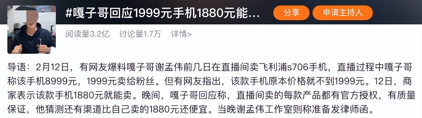 最近的,他上个月还又一次因为带货上热搜,咱也聊过,因为嘎子卖的 699 元手机被质疑手机官网没有这款产品。