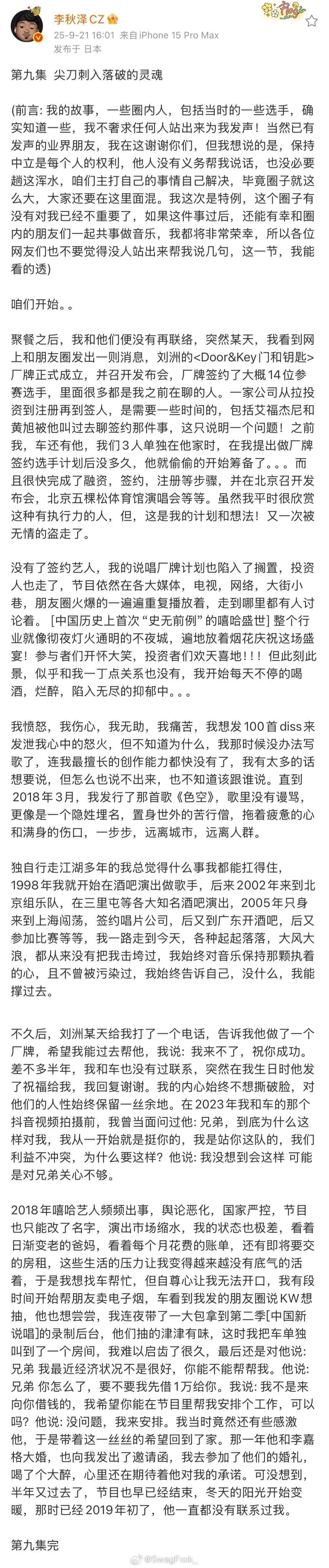 果不其然,就在今天,李秋泽再次更新《有嘻哈往事第九集:尖刀刺入落破的灵魂》!