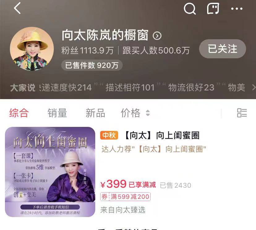 向太都是老板娘了,她的课也卖得不是很好,但比王晶的好一些,卖出2430次。