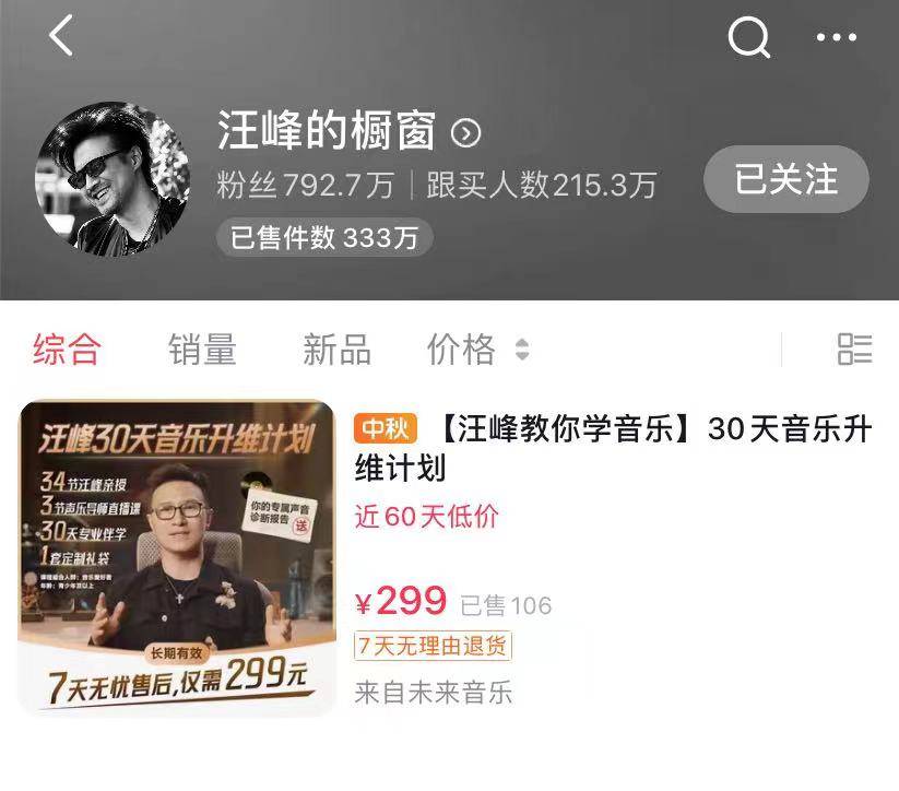 汪峰也在卖课,教网友学音乐,价格299元,只卖出106次,这个也太少了。汪峰毕业于中央音乐学院,内地摇滚教父,如果他的课都卖不出去,那真的让人困惑,可能汪峰的私生活影响了他的社会风评。